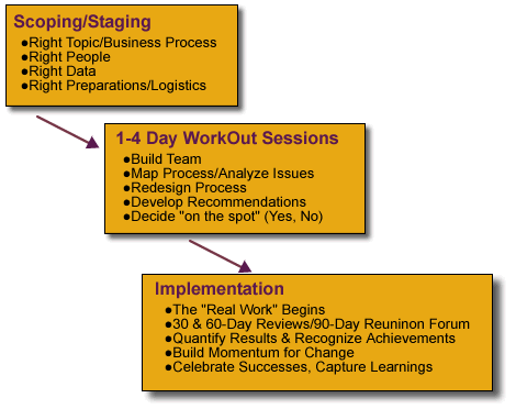 - Lastly, the WorkOut Process acts to Facilitate Change. It provides a means to attain quantifiable business improvement while providing a “continuous-learning opportunity” for changing how people work together.